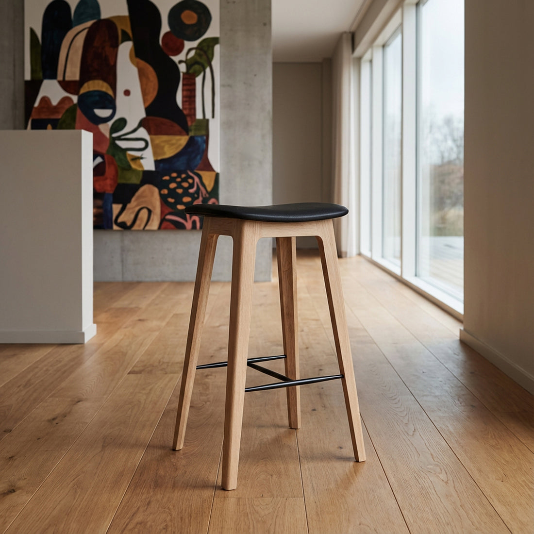 - Nordic Bar Stool Oak in light wood with leather seat