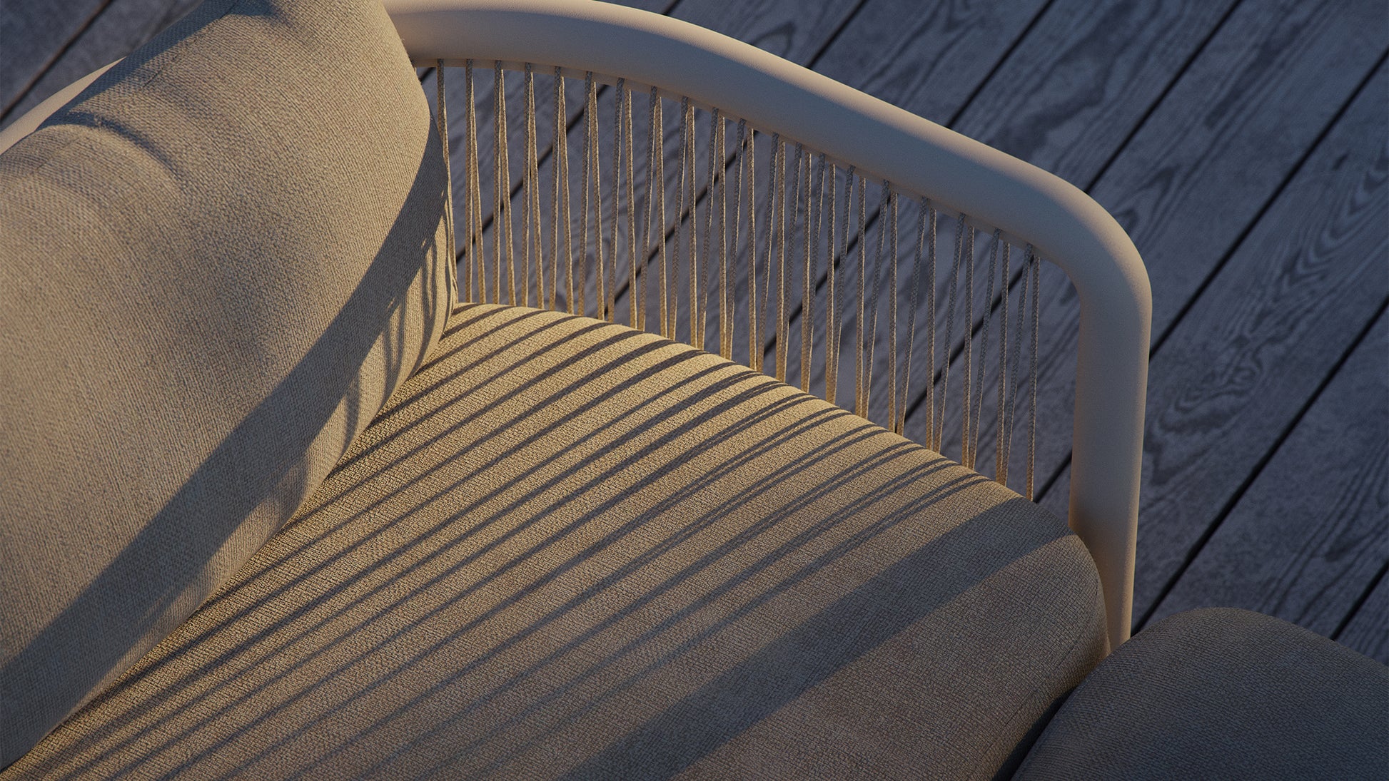The frame is crafted from powder-coated aluminum that won’t rust, even with prolonged exposure to rain and moisture. The upholstery is made from olefin fabric, 20% of which is recycled material, making it highly resistant to everyday use and changing weather conditions. The fabric offers high lightfastness (7–8), meaning the color remains vibrant even in strong sunlight.