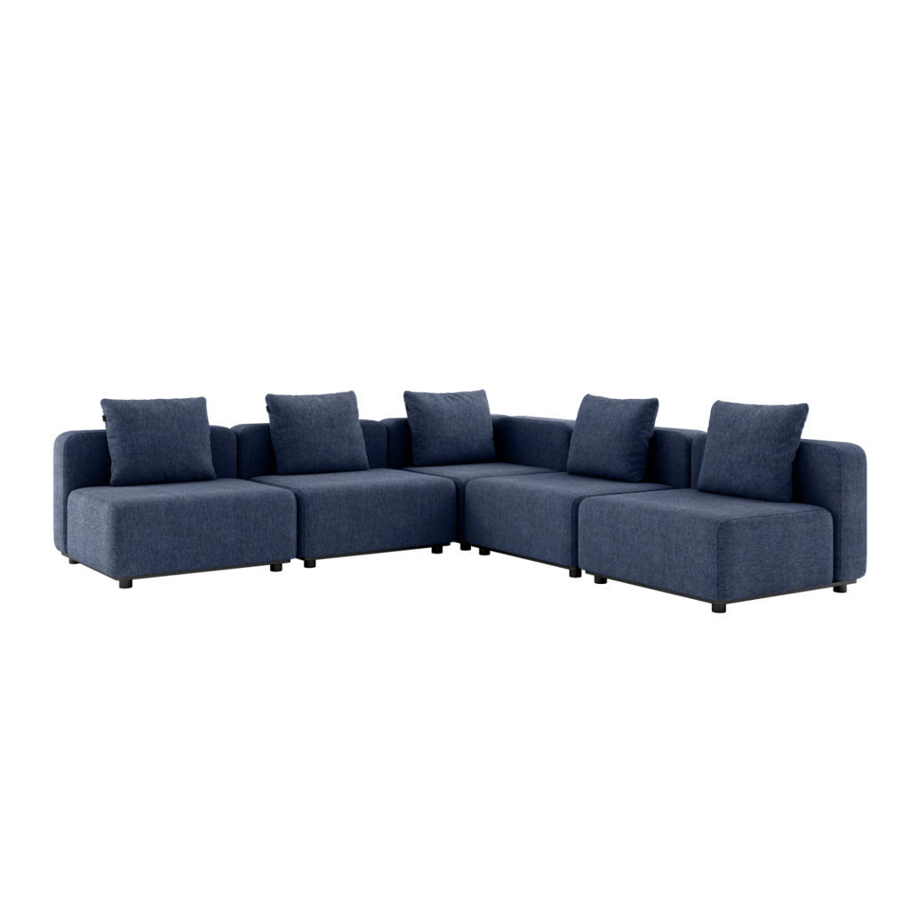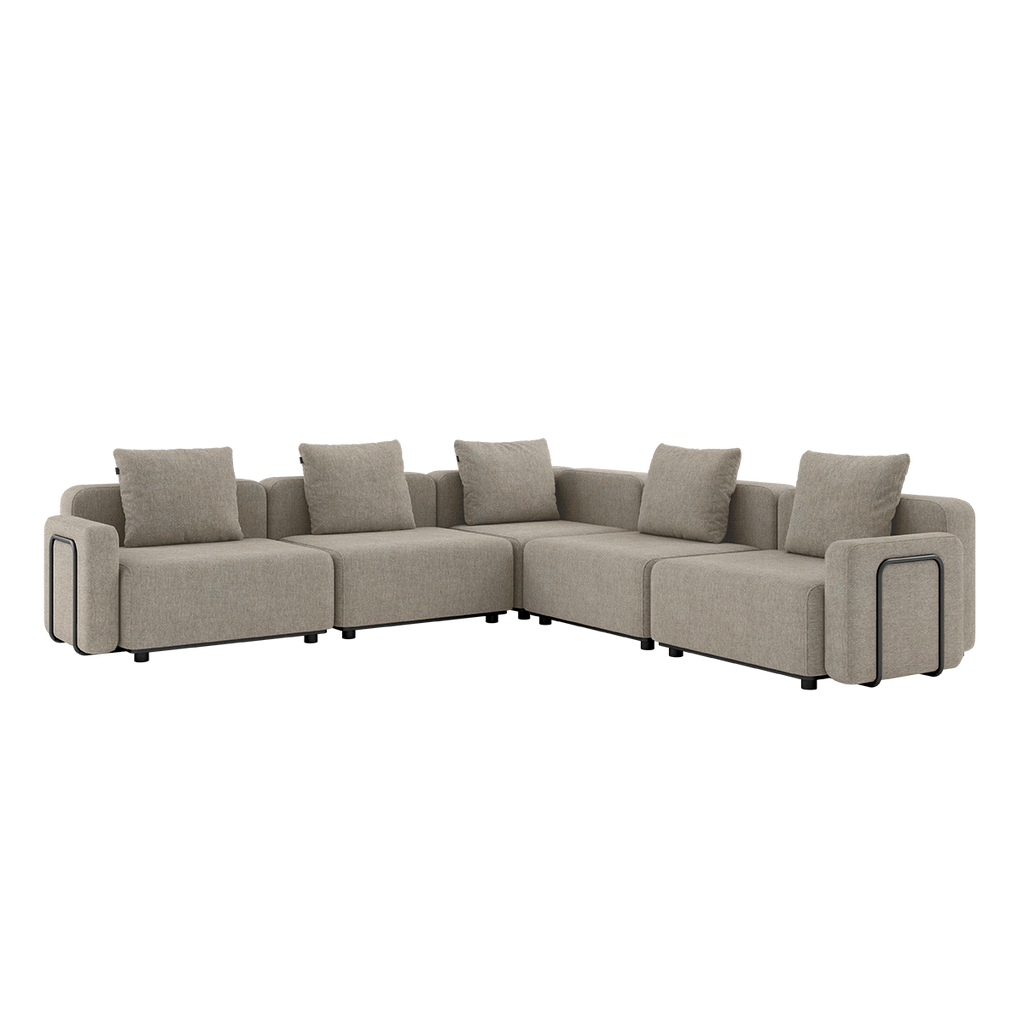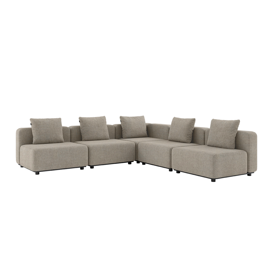 The lightweight modules make it easy to change the layout as needs evolve, without compromising stability or comfort. The construction is built around a powder-coated aluminium frame and durable materials developed for year-round outdoor use. The sofa is available in olefin textiles (Kirra and Cobana) as well as Sunproof Bouclé. The fabrics are water- and dirt-repellent, quick-drying, and UV-resistant, helping the sofa retain its shape, function, and colour over time.