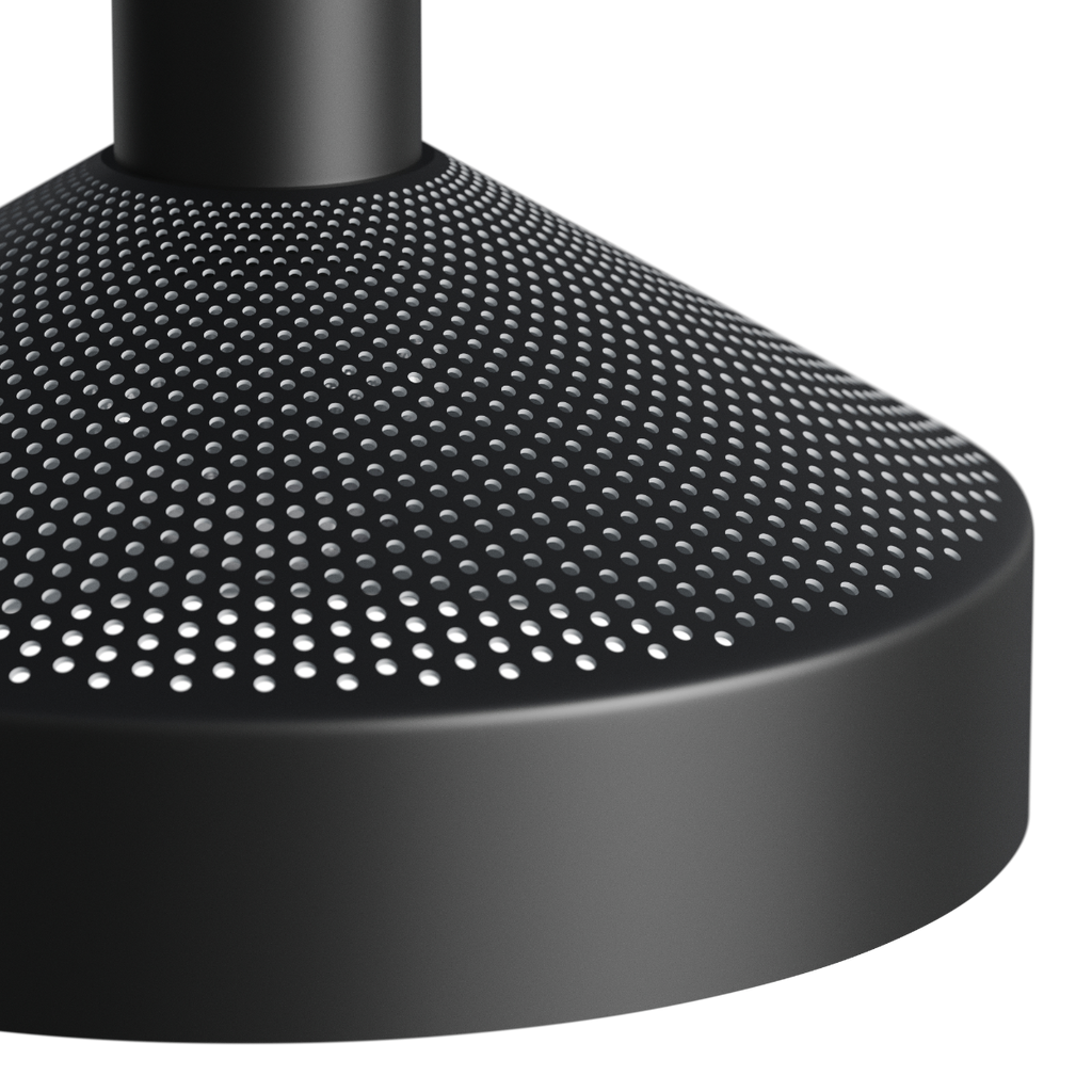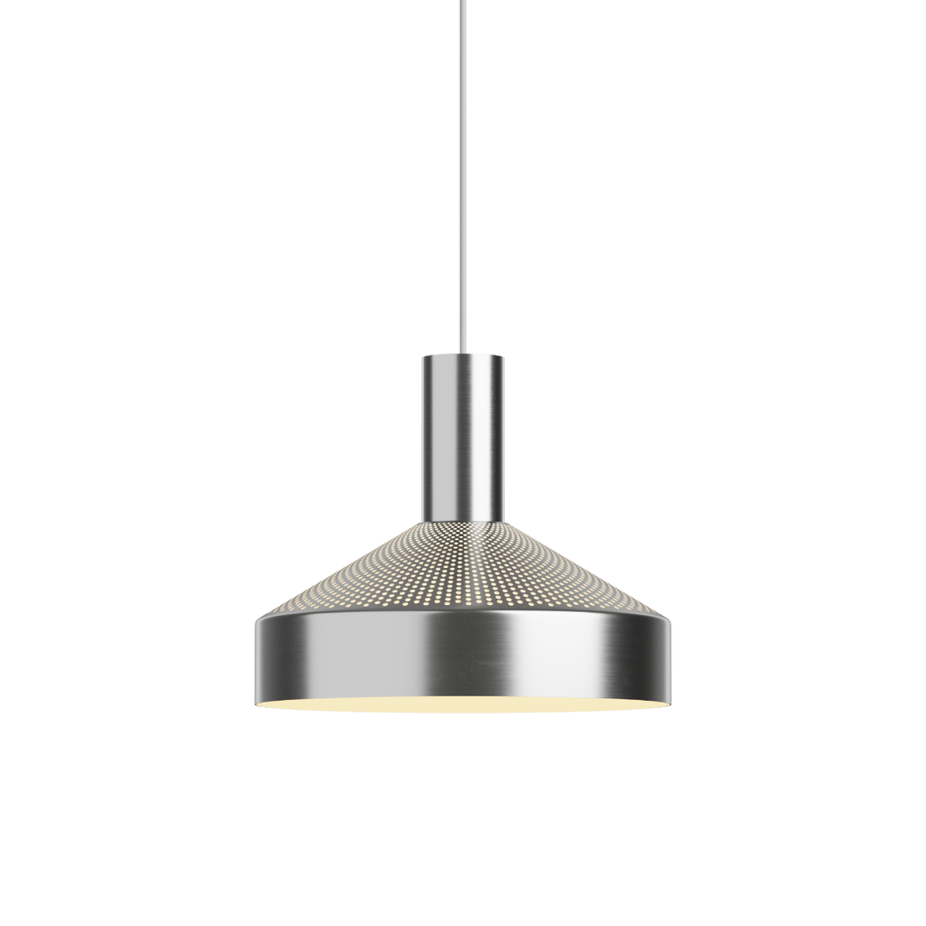 The Dawn pendant is inspired by the classic workshop pendant, featuring a laser-cut perforation at the top that provides comfortable and expansive lighting. The lamp’s functional illumination is enhanced by the white-painted inner shade and the built-in light source. The distinctive kink at the edge of the lamp directs the light more precisely, while the perforations allow for both upward and downward lighting.
