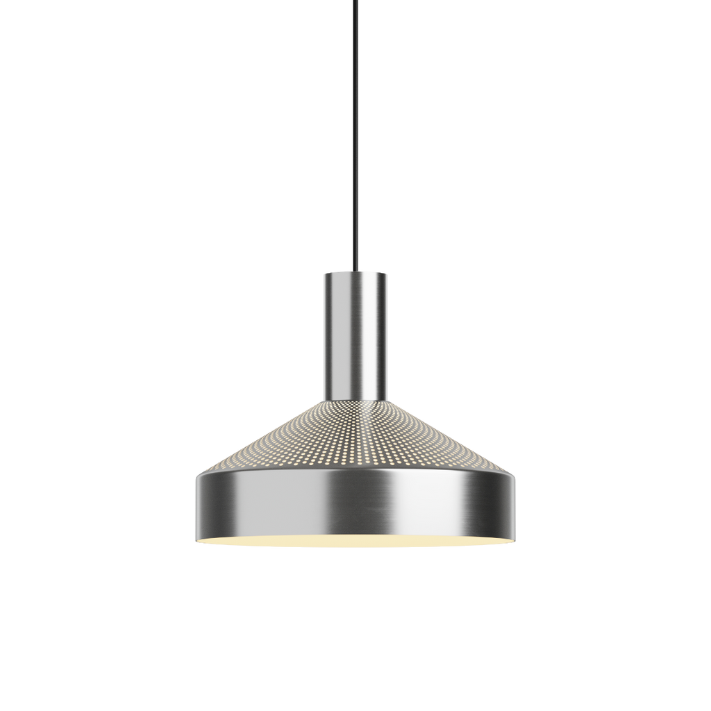 The Dawn pendant is inspired by the classic workshop pendant, featuring a laser-cut perforation at the top that provides comfortable and expansive lighting. The lamp’s functional illumination is enhanced by the white-painted inner shade and the built-in light source. The distinctive kink at the edge of the lamp directs the light more precisely, while the perforations allow for both upward and downward lighting.