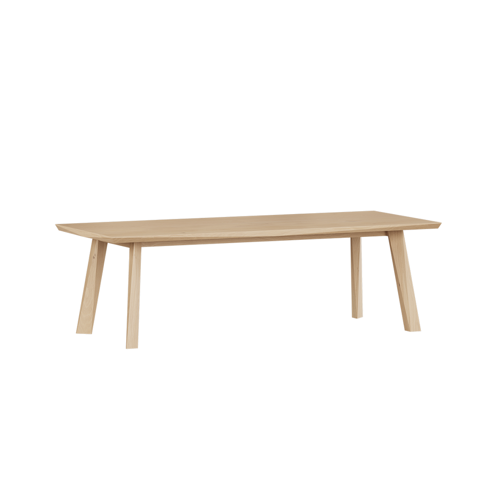 An aesthetically stunning dining table made from European oak with gorgeous detailing and carefully crafted facets. The table's unique composition of natural wood introduces a touch of nature into your living space. These facets imbue the table with a distinct character, ever-evolving as they changes with the shifting daylight, lending a subtle dynamism to its design.