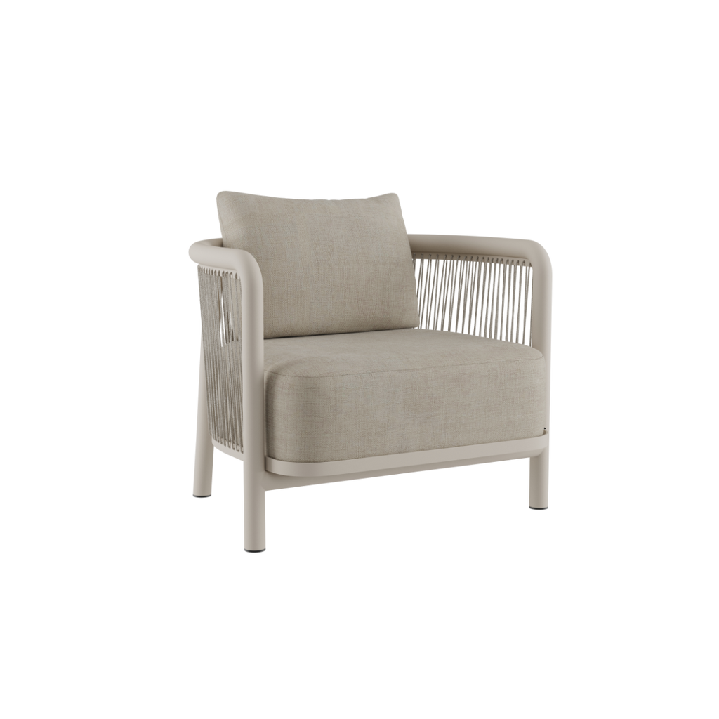 The construction is built around a powder-coated aluminium frame that does not rust, combined with durable textiles with high lightfastness (7–8). The cushions are made with Quick Dry Foam, allowing the sofa to dry quickly after rain and remain outdoors all year without the need for storage.