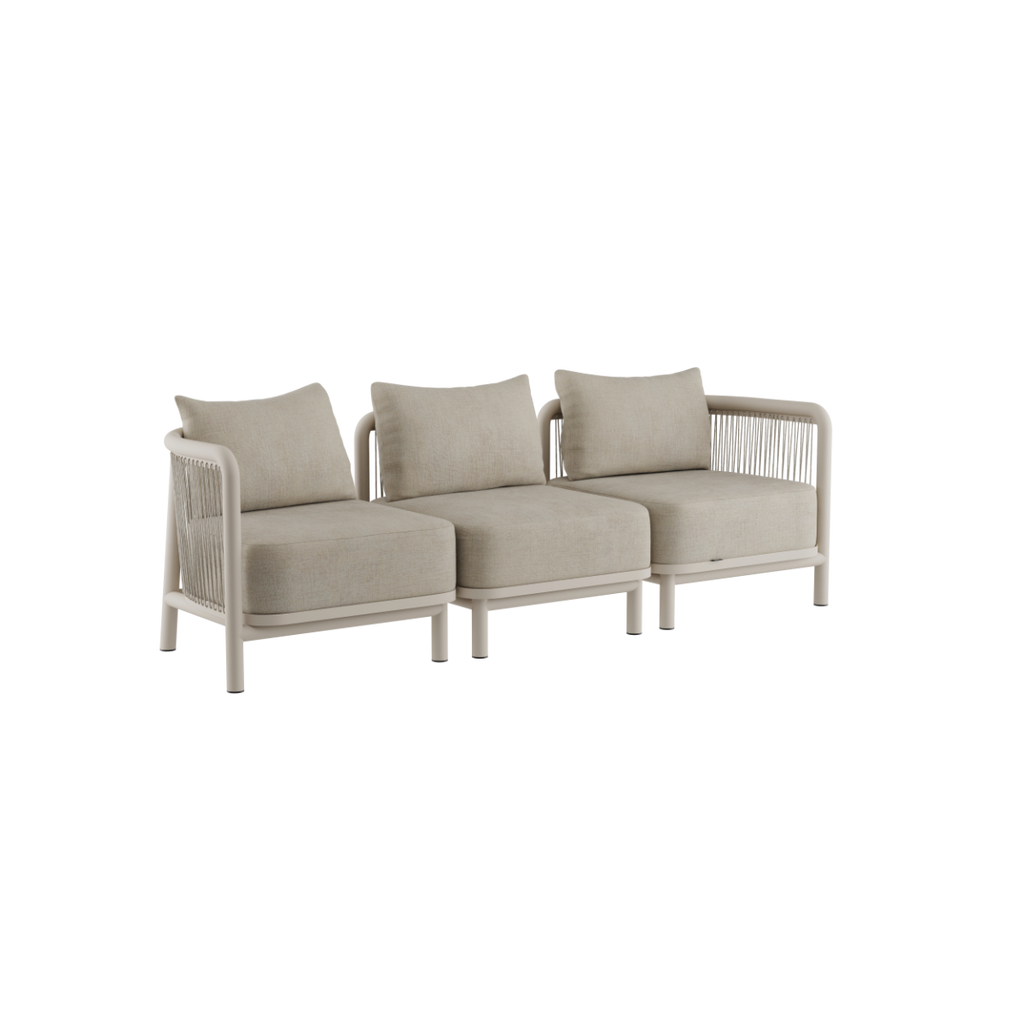 The construction is built around a powder-coated aluminium frame that does not rust, combined with durable textiles with high lightfastness (7–8). The cushions are made with Quick Dry Foam, allowing the sofa to dry quickly after rain and remain outdoors all year without the need for storage.