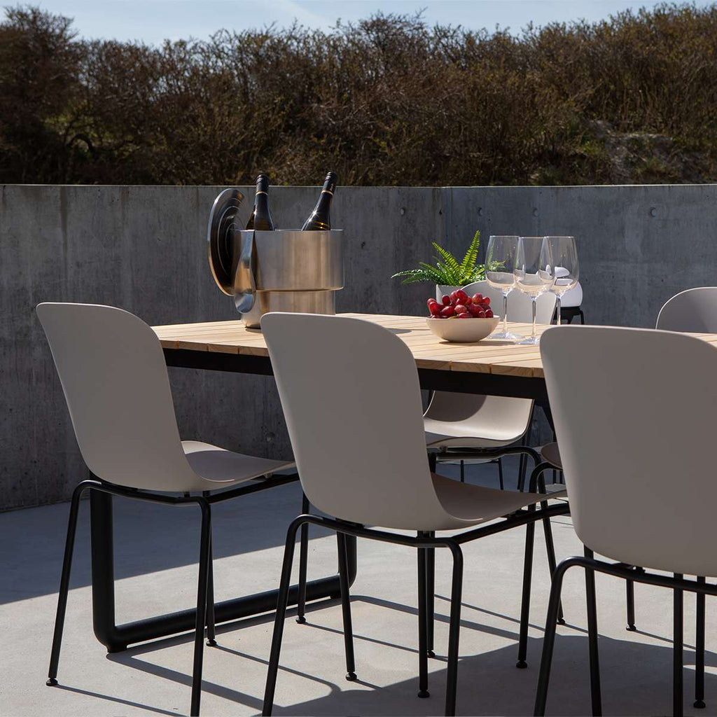 Enjoy life outside with Patio Chair no. One. An outdoor dining chair in an uncompromising design with a focus on comfort and aesthetic. The shell is made of reused plastic and the frame of powder-coated steel. A design that embraces you with fantastic comfort and support.