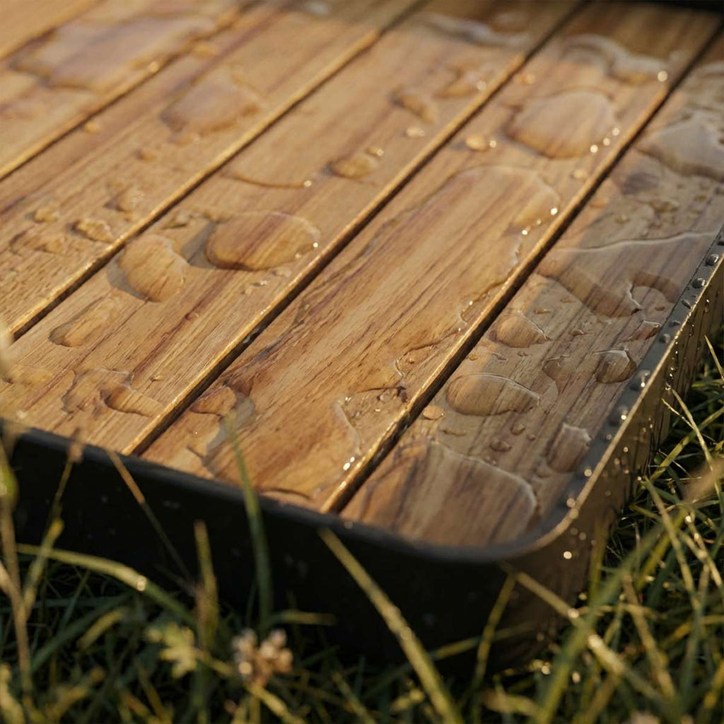 We recommend treating the teak surface with oil from time to time, similar to wooden tabletops and outdoor furniture. See our teak guide for care and maintenance.