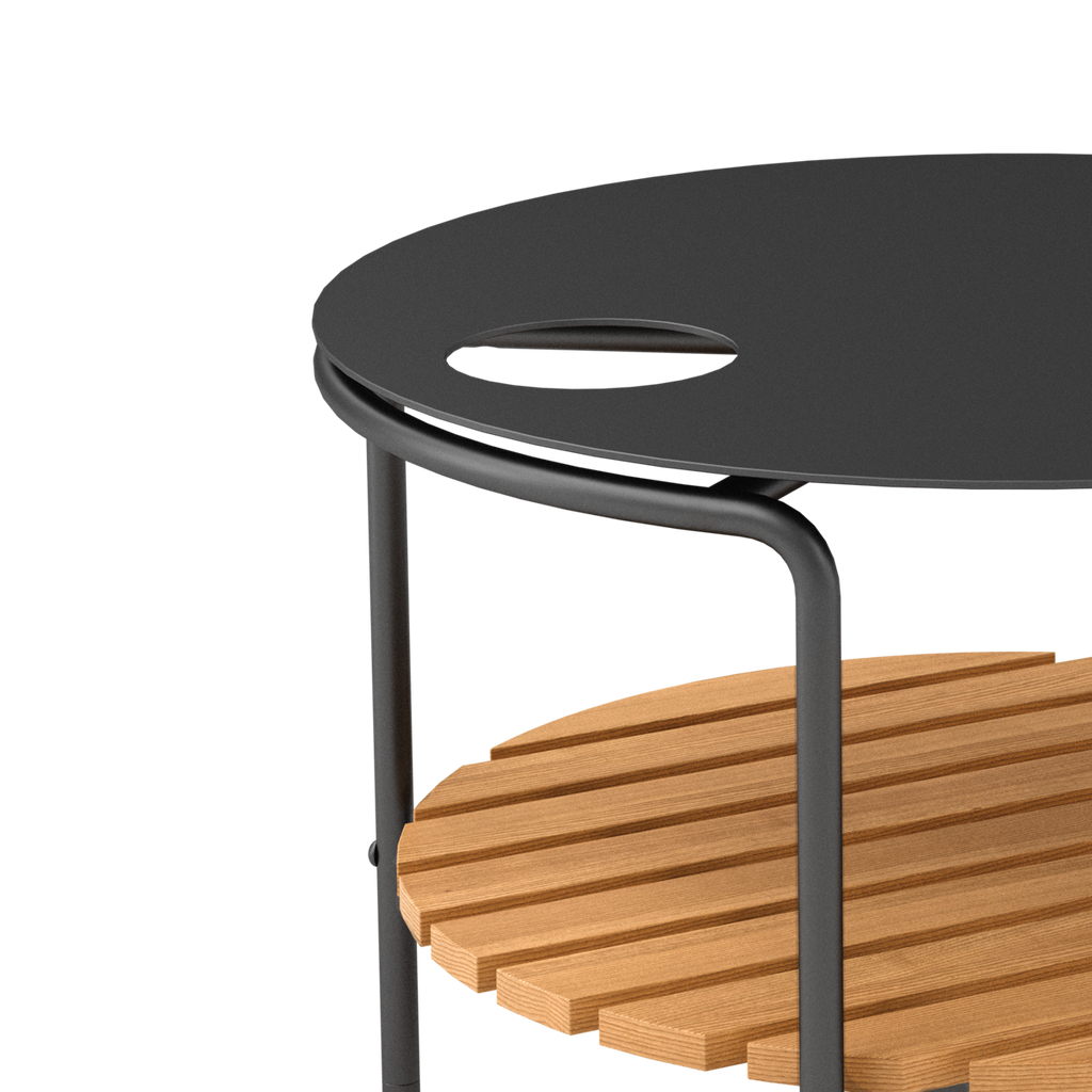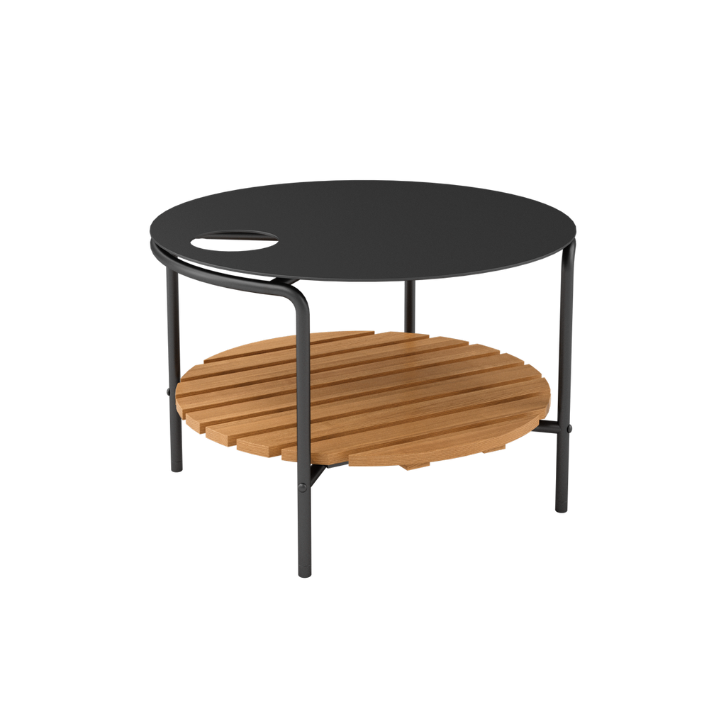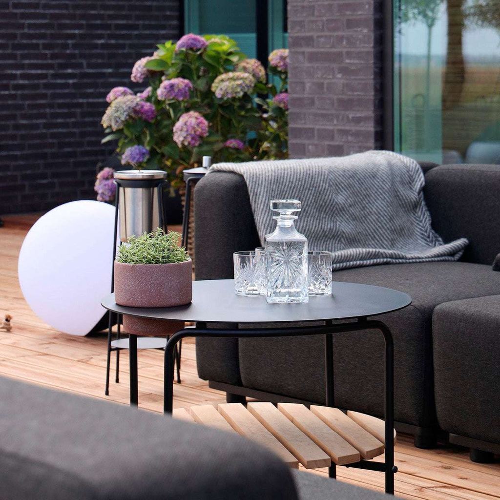 Patio Sofa Table is an outdoor sofa table in powder-coated aluminum with a teak wood shelf underneath. Clean lines, high-quality materials, and a multi-functional design brings your outdoor area to a whole new level.